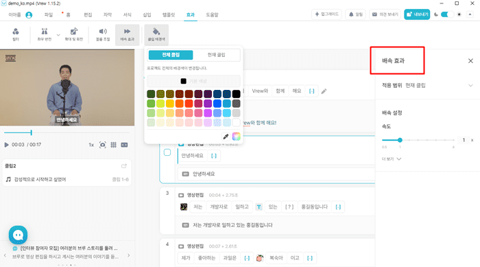 배속이나 좌우 반전, 확대 및 회전이 가능합니다. 배경색을 변경하는 곳도 이 메뉴에서 수행할 수 있습니다.