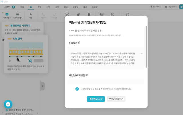 VREW가 올바르게 실행되면 이용약관에 동의하기가 보입니다. [동의하고 시작하기]를 누릅니다.
