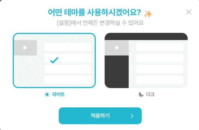 4. 테마는 라이트나 다크 중 원하시는 걸 선택할 수 있습니다.