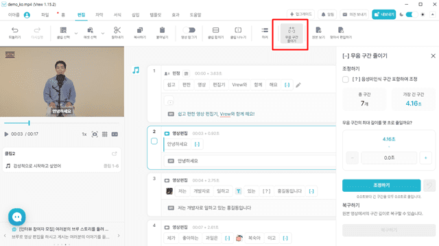 [편집] 메뉴에서 무음구간 줄이기는 영상 사이사이에 들어간 무음을 자동으로 감지하여 삭제하여 콘텐츠의 퀄리티를 향상할 수 있습니다. 이 외에도 영상편집에 필요한 잘라내기, 영상 잠그기 등을 사용할 수 있습니다.