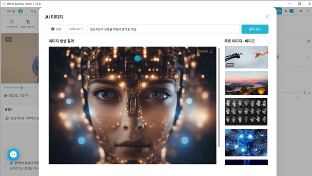 또한 AI 이미지 제작도 편리하게 가능합니다. ‘인공지능이 생명을 마침내 얻게 된 모습’이라고 입력하였더니 다음과 같은 사진을 제작하였습니다. 너무 신기하고 저작권 걱정 없이 다양한 이미지를 사용할 수 있다는 장점이 있습니다.