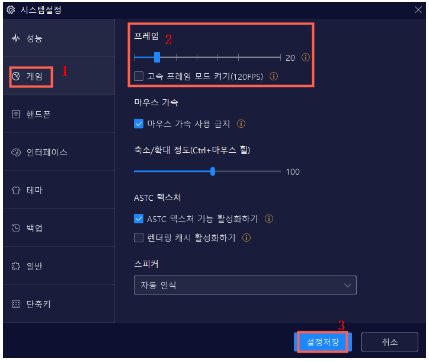 - 이후 게임 탭을 선택합니다. 기본값은 60프레임으로 설정되어 있지만 취향 것 변경하실 수 있습니다.