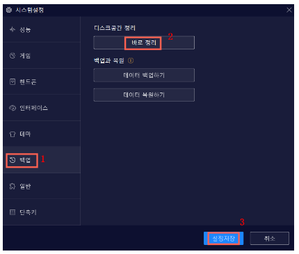 [백업]→[디스키 공간 정리]→[바로 정리] *정리 완료될 때가지 가디려 주세요. 정리 완료하기 전에 녹스를 강제 종료하지 마세요.