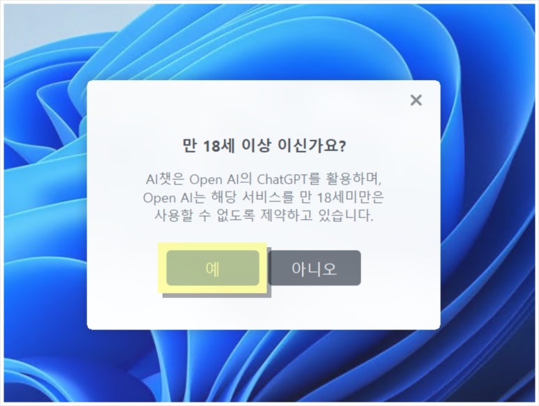 13. ChatGPT와 대화하기 위해 예 단추를 누릅니다. 그럼 인공지능 챗볼을 이용하여 궁금한 내용을 묻고 그에 해당하는 답변을 확인할 수 있어 무척 유용하였답니다.
