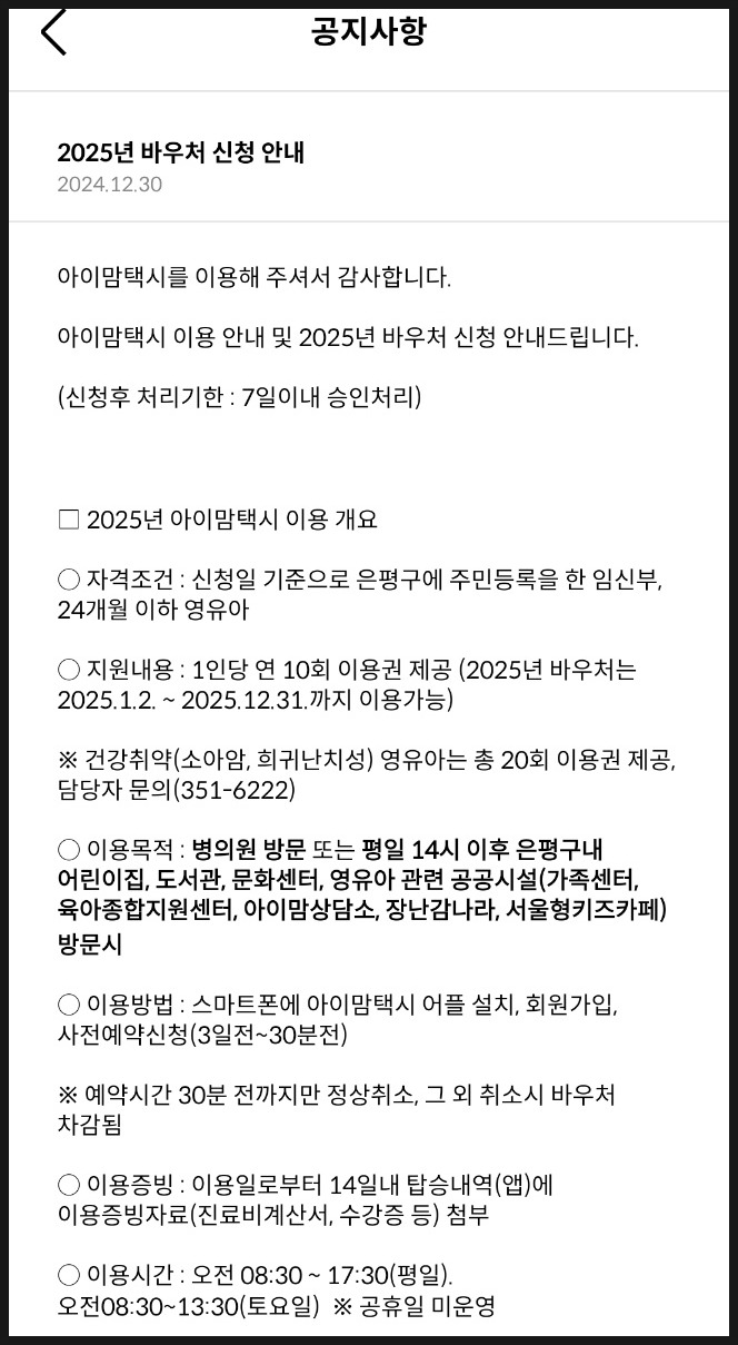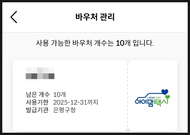 2024년에 아이맘택시를 이용했던 분들은 주민등록등본(은평구 거주)을 제출 담당자님이 7일 이내 검토후 승인처리하면 무료 바우처 10개가 생겨요. 저는 주소지가 동일해서 등본 제출했더니 바로 승인해주셔서 2025년 바우처가 10개 생겼어요.