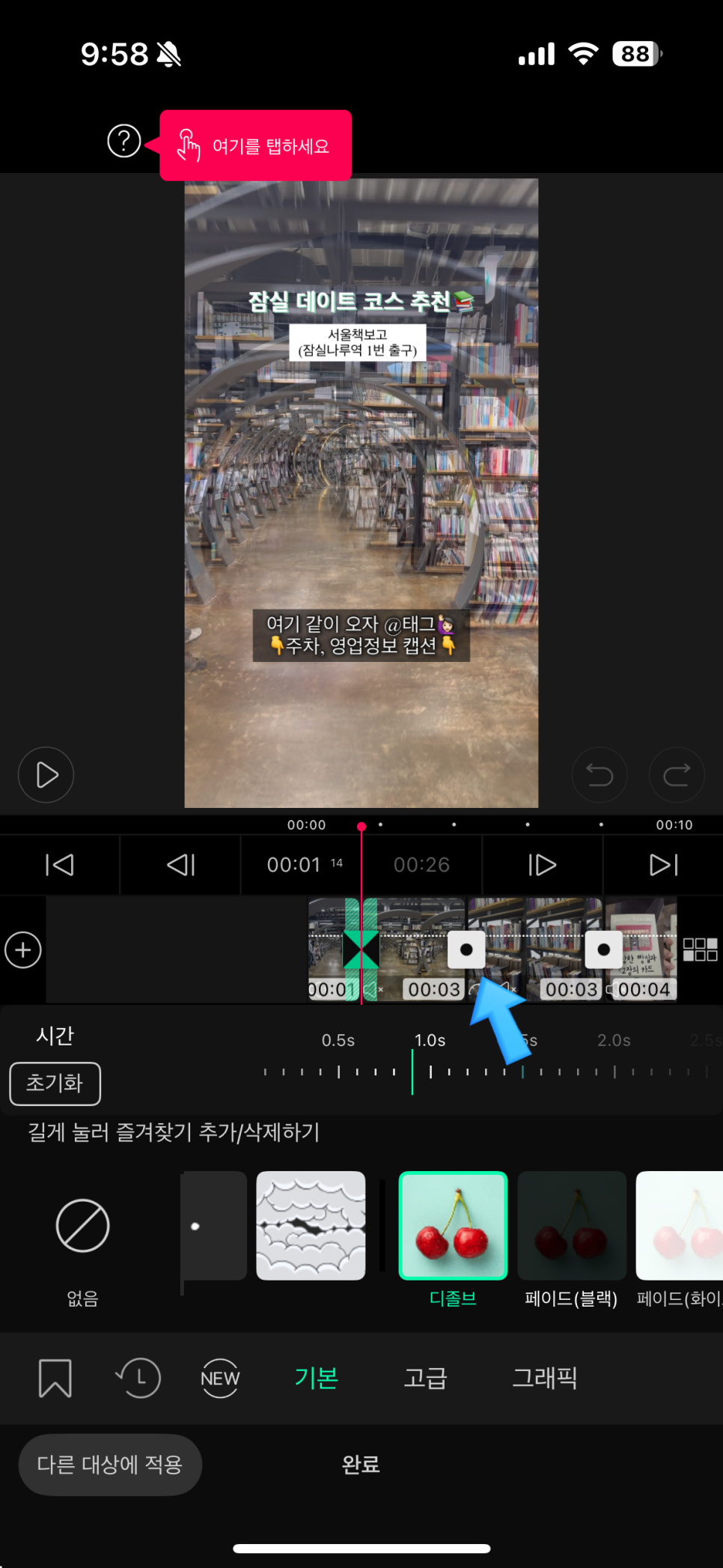 선택한 비디오, 사진이 나열되면 사이사이에 동그란 점 버튼이 생기는데요, ​이 버튼을 누르면 비디오, 사진 사이에 전환 효과를 넣어줄 수 있습니다.