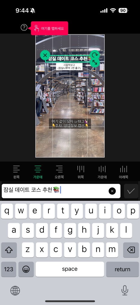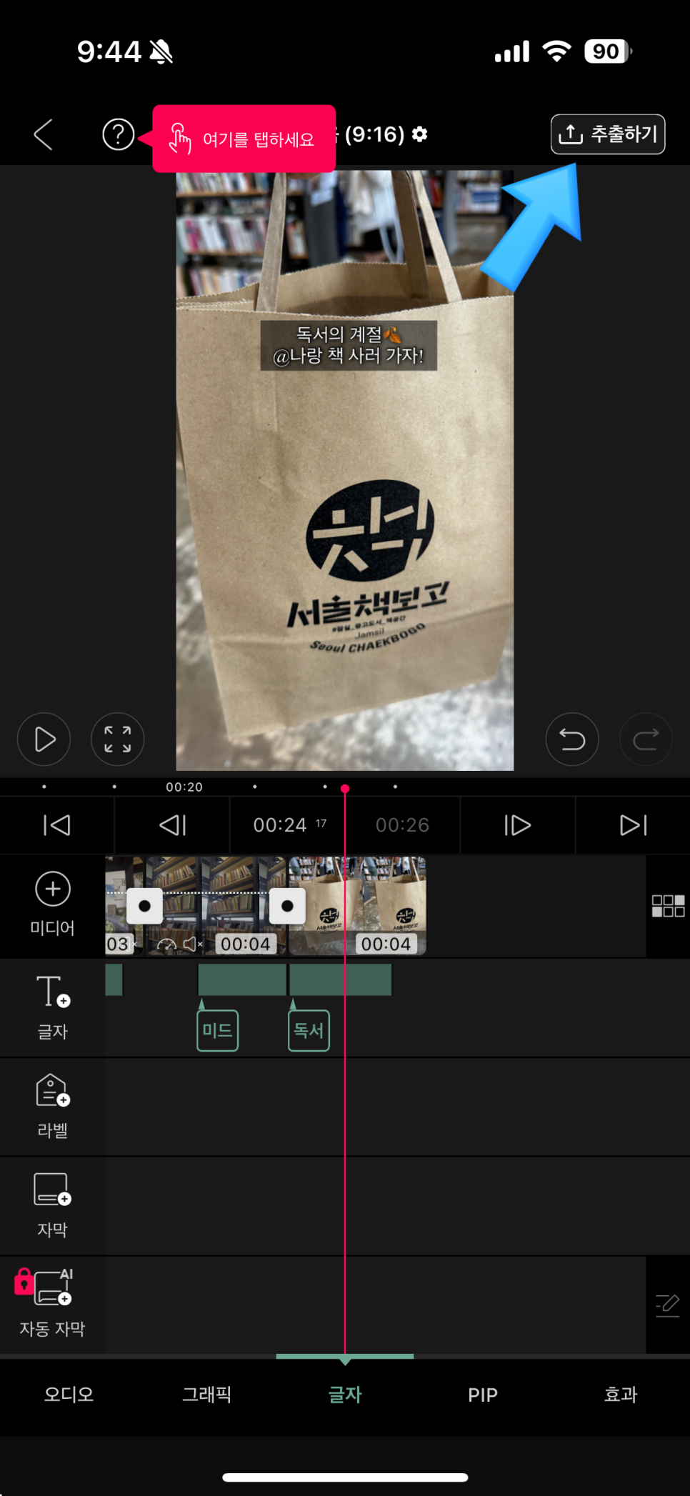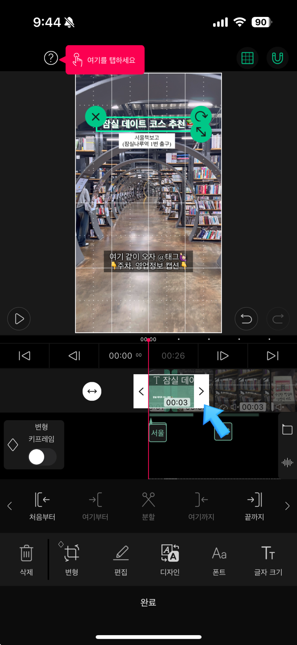 원하는 글씨를 넣어준 뒤에는 영상 길이에 맞춰 텍스트 노출 시간을 드래그해서 조절해 주시면 돼요.