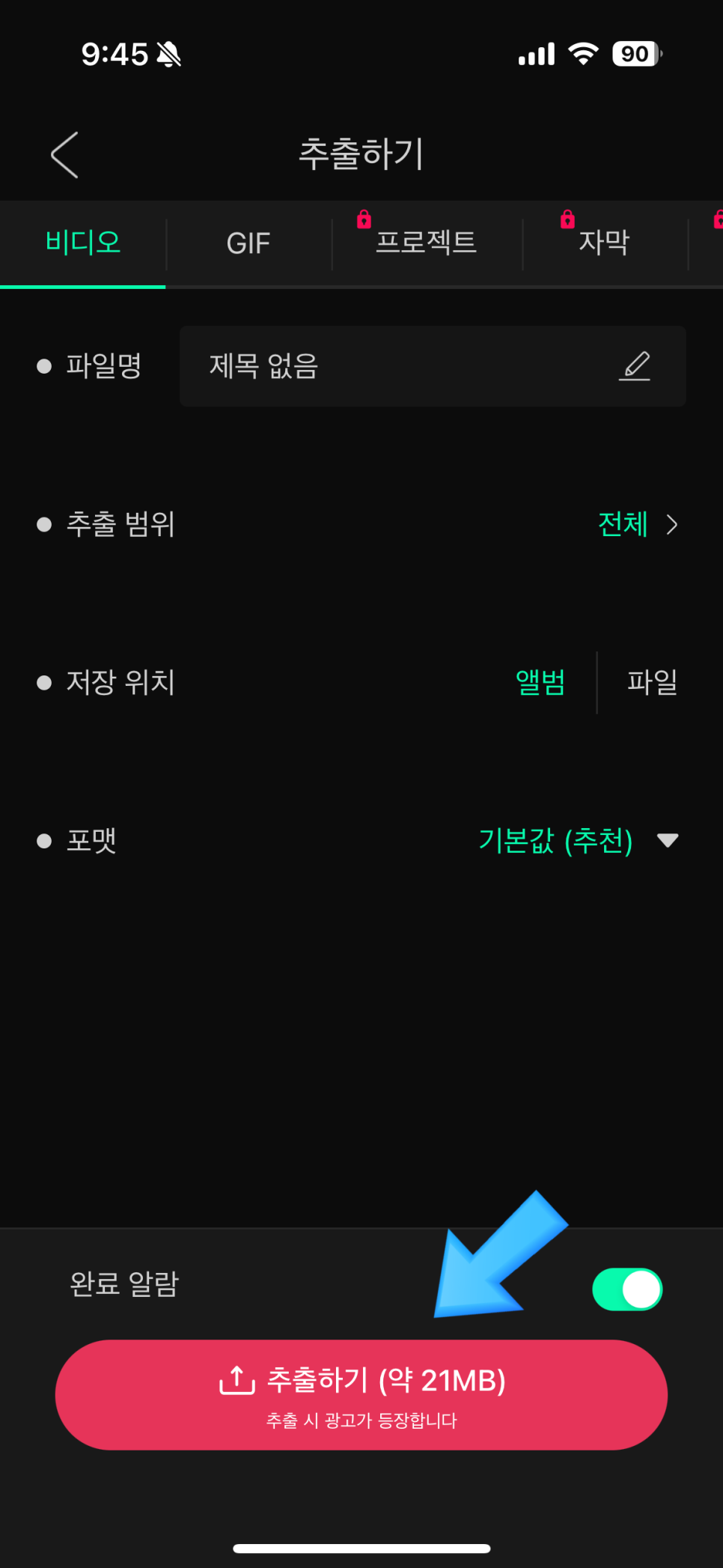기본 설정은 건드리지 않아도 되고, 추출하기를 한 번 더 눌러주면 광고가 나온 뒤에 영상이 저장됩니다.
