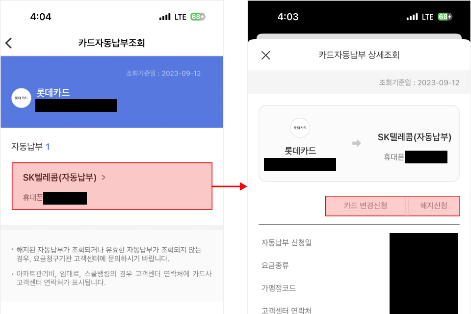 그리고 앱에서 계좌자동납부, 계좌자동송금, 카드자동납부를 변경하거나 해지도 가능해요. 전기비 같은 일부 공과금 같은 경우는 변경 및 해지가 불가능해요. 이런 변경 및 해지가 불가능한 자동납부는 해당 기관에서 직접 변경해야 해요.