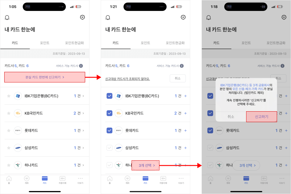 그리고 앱에서 분실한 모든 카드를 한 번에 신고할 수 있어요.