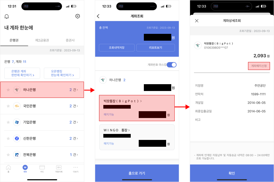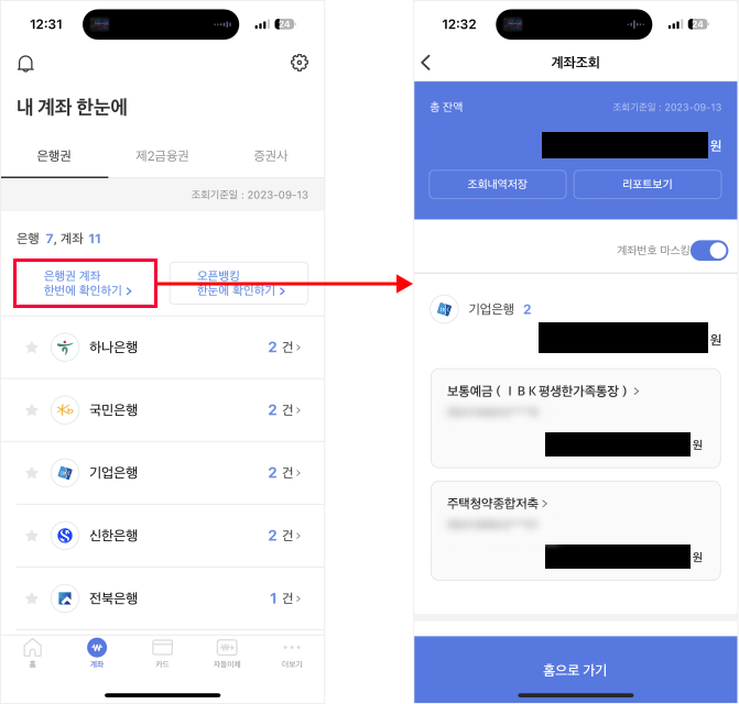 그리고 은행권 계좌 한 번에 확인하기 버튼을 누르면 모든 계좌의 돈을 한 화면에서 모두 확인이 가능해요.