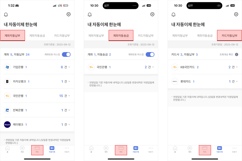 하단의 네 번째 메뉴인 자동이체로 이동하면 계좌자동납부, 계좌자동송금, 카드자동납부를 모두 확인할 수 있어요.