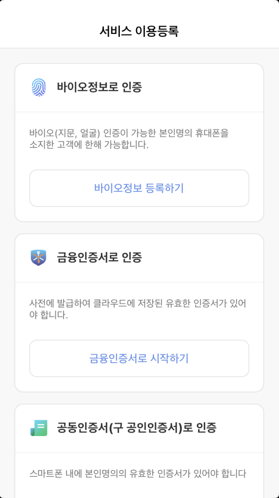 나의 계좌와 카드 등의 금융 정보를 확인하기 위해서는 본인인징이 필요하겠죠? 3가지로 본인인증이 가능하기 때문에 편리한 방법으로 본인인증을 완료해 주세요.