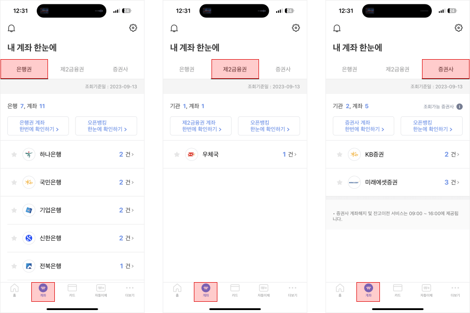 하단의 두 번째 메뉴인 계좌로 이동하면 나의 은행권(계좌), 제2금융권, 증권사를 모두 확인할 수 있어요.