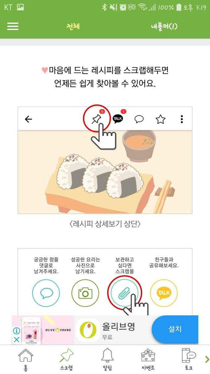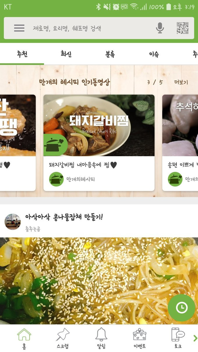 그리고 내가 즐겨찾는 레시피들을 편리하게 스크랩해서 폴더를 만들어 정리할 수도 있고 다른 사람들이 스크랩 해놓은 요리들을 확인해 볼 수도 있습니다.