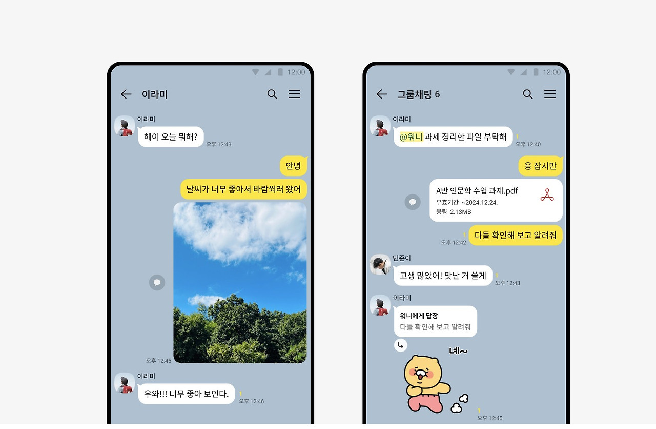 텍스트 메시지뿐 아니라 사진, 동영상, 파일도 주고받을 수 있어 업무 및 자료 공유에 최적화되어 있습니다.