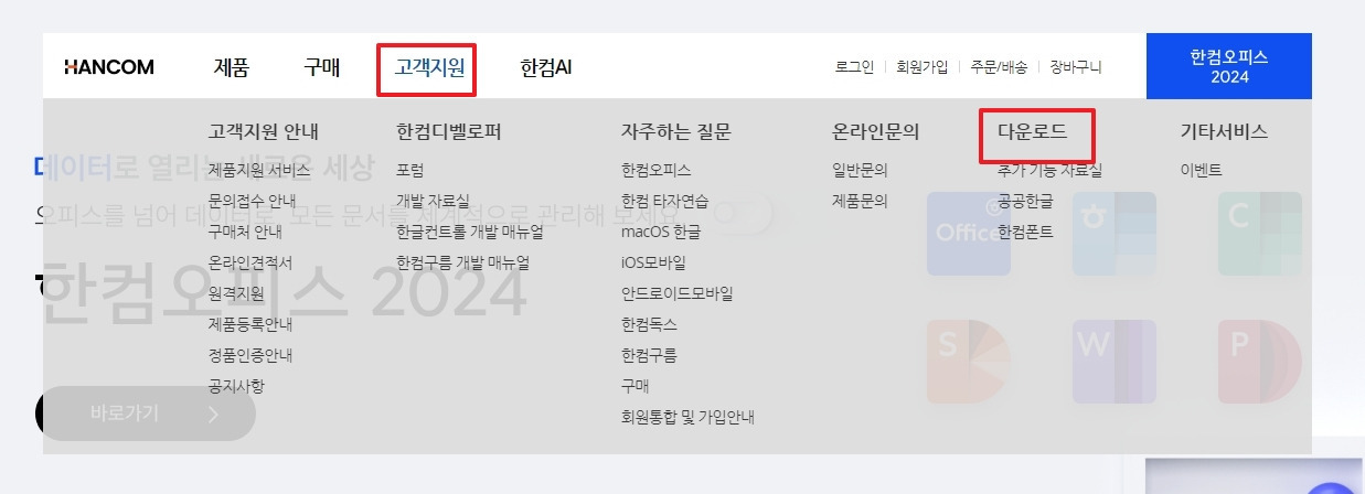 1. 한글과컴퓨터 공식 홈페이지에 접속합니다. 이곳에서는 한컴오피스뿐만 아니라 다양한 소프트웨어 제품과 서비스도 함께 제공됩니다. 다운로드 페이지로 이동하려면 상단 메뉴에서 고객지원을 찾은 후, 다운로드 섹션을 클릭하세요.