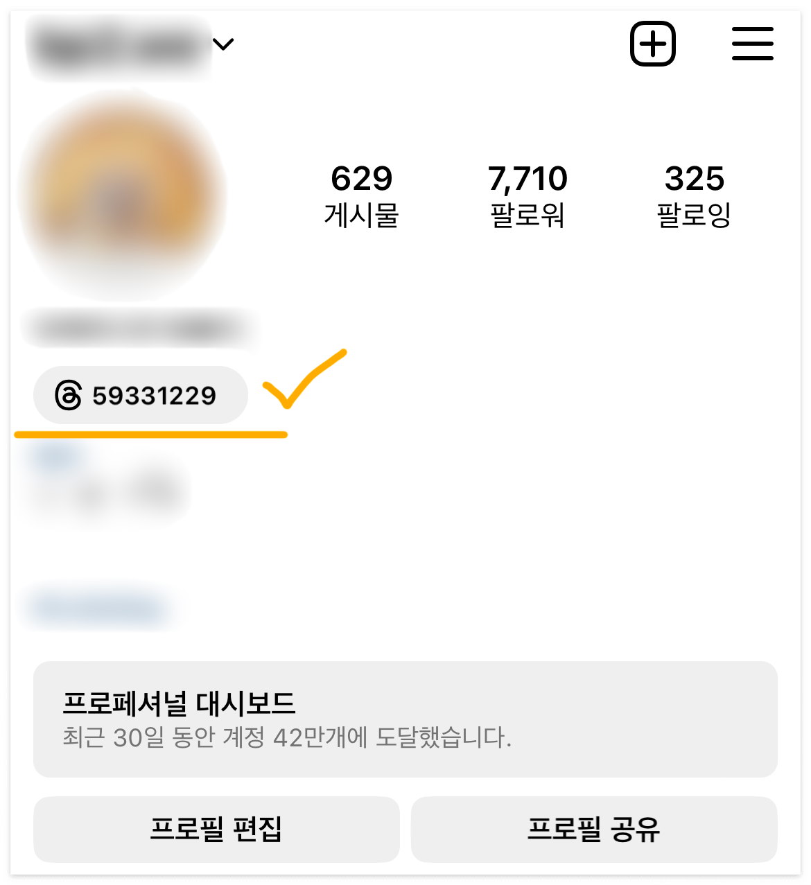 프로필 사진 밑에 이렇게 threads의 고유 번호 배지가 생성된 것을 볼 수 있습니다 이것을 클릭하면 바로 내 스레드 계정으로 이동이 됩니다 간편하게 인스타그램과 스레드를 왔다 갔다 할 수 있습니다 물론 내 인스타그램에 방문한 다른 사람들도 이 배지를 통해 내 스레드 계정으로 이동할 수 있습니다.