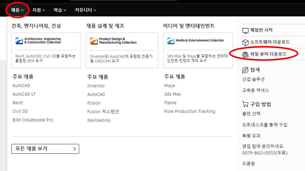 1) 먼저 오토캐드 공식사이트인 오토데스크 홈페이지에 접속을 해서 제품 > 파일 뷰어 다운로드로 갑니다.