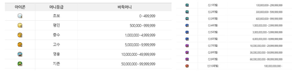 바둑머니 보유금액에 따라 총 16단계의 등급으로 구분(신등급이 10단계)