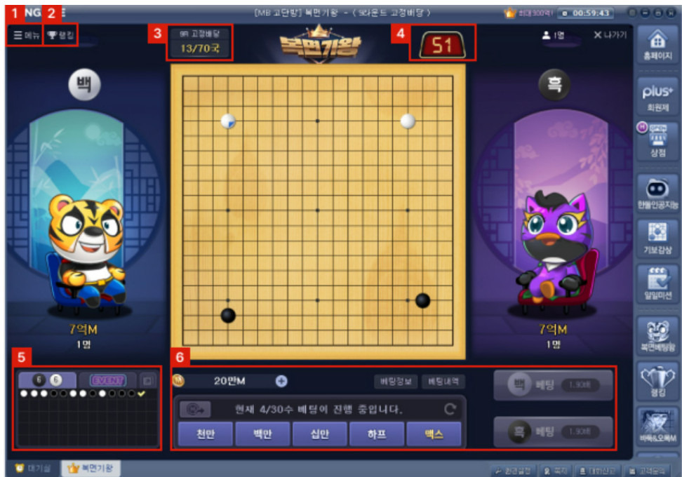 6. 베팅영역 : 자신의 보유머니, 베팅정보, 베팅내역 확인이 가능, 베팅금액 버튼을 클릭하여 복면기왕 대국에 베팅