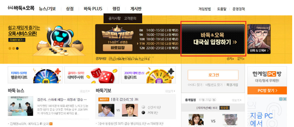 • 한게임에 로그인하시고 한게임 바둑에서 ‘대국실 입장’을 클릭합니다.