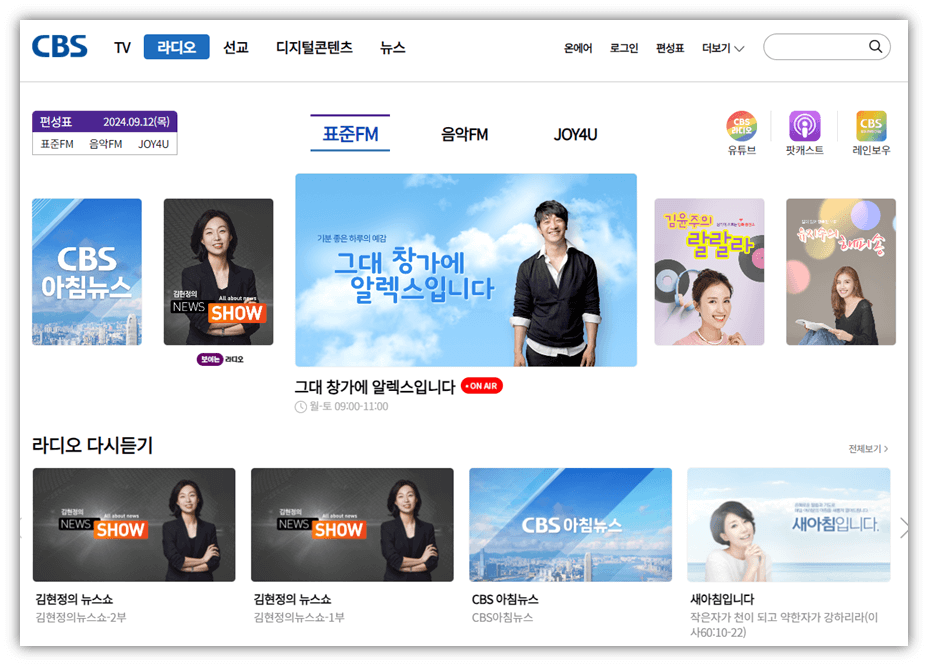 CBS 라디오 홈페이지에 접속했다면 실시간 방송 중인 표준FM, 음악FM, JOY4U 라디오 실시간 방송을 듣는 것도 가능하고요. 편성표나 선곡표를 보거나 라디오 다시듣기도 이용할 수 있습니다.